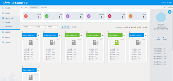 充电站监控页面监视用户充电枪总数、正在充电的枪数、空闲枪数、插枪数量、故障枪数量等,汇总了用户拥有各桩的当日充电总次数、总电量、总时长,进行负荷限制、故障查询。