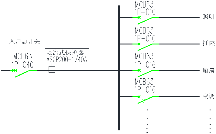 ASCP200-1型电气防火限流式保护器建议安装在开关下端,额定电流值根据开关的具体规格进行设置,典型应用示意图如图2所示: