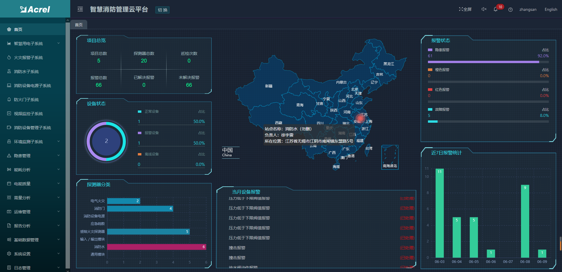 用户登录成功之后进入主页,如图所示。主要展示的内容有:项目概况、设备状态、设备分类、设备报警信息、报警分类、报警统计、设备台账信息等。其中百度地图可以选配成BIM建筑模型,任何传感器报警时可以在BIM模型中预警显示。
