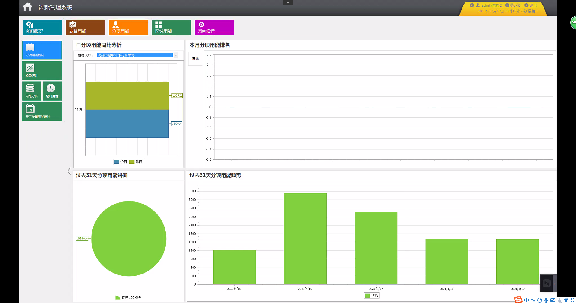 Acrel-5000能耗管理系统可以按照分项进行能耗统计与显示。其中,日分项用能同比分析图显示不同分项的当日与昨日能耗柱状图(蓝色柱表示今日,绿色柱表示昨日);用能饼图显示各分项过去31天的用能占比;堆积图显示各分项过去31天的能耗趋势;分项用能排名图显示被选中分项对应能耗值排名位的支路。