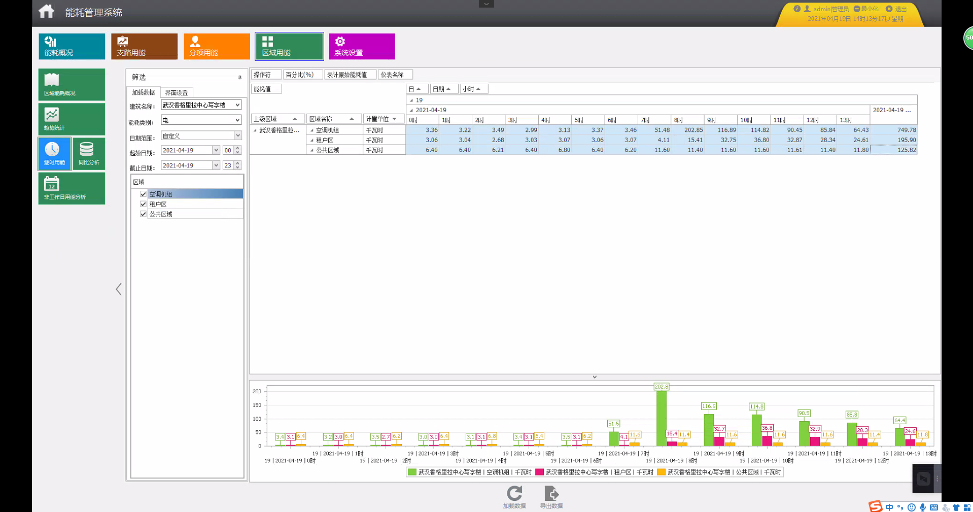 Acrel-5000能耗管理系统可以统计各支路某段时间内逐日、逐周、逐月、逐季、逐年用能。选择需要查询的支路,点击‘加载数据’查看各支路用能趋势,可根据已有的日期或者自定义时间进行查询,并可以将支路用能显示合计,以图表形式显示。