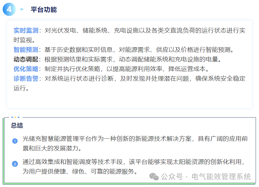 总的来说,智能科技和绿色能源相结合的光储充智慧能源管理平台是一种具有重要意义的能源管理方式,它可以有效地利用可再生能源,提高能源利用效率,同时还能提供一定的调峰能力,对于推动绿色低碳发展、促进能源结构优化具有积极作用。