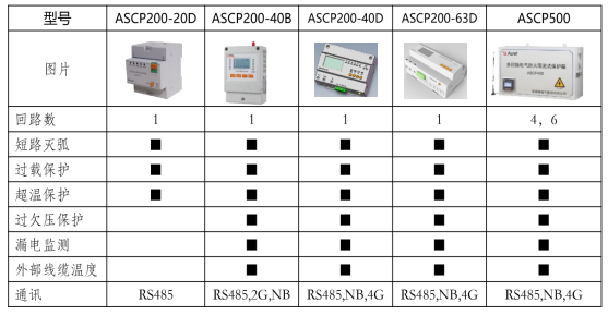 本工程设计选用了安科瑞ASCP系列的电气防火限流式保护器,其产品具有功能丰富,型号多样等特点,具体如下表所示:
