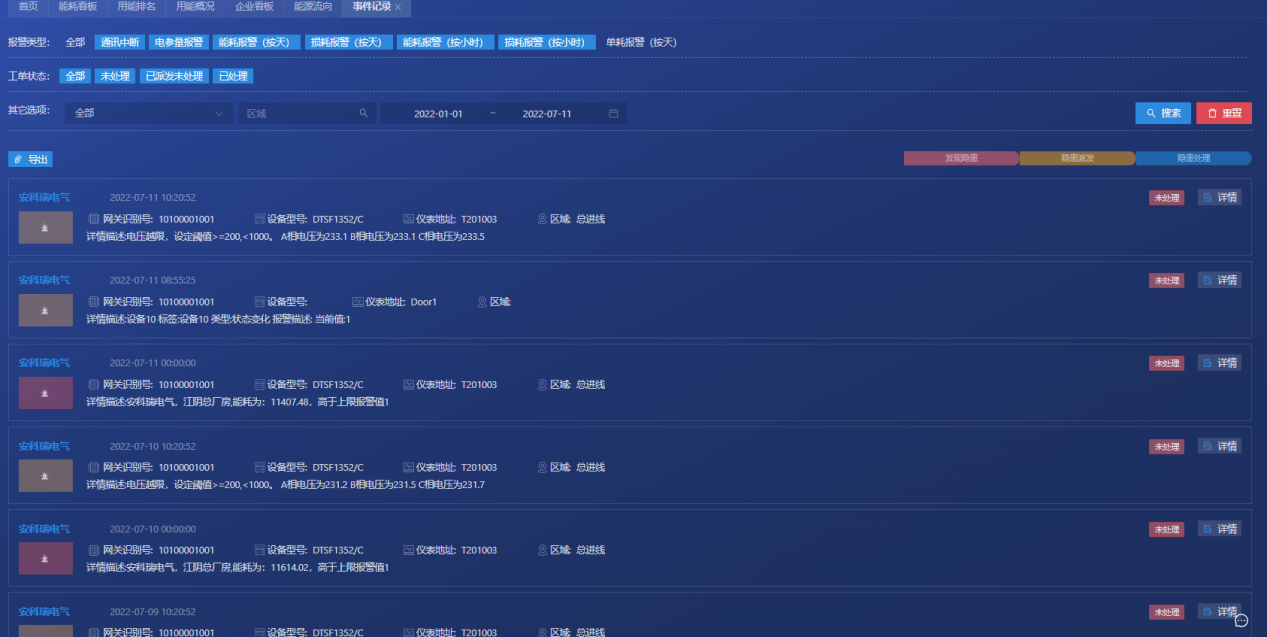 平台提供能源报警功能,一旦发现跑冒滴漏,能源消耗异常,电参量异常等情况,能提供多种方式的报警,包括但不限于邮件、短信、钉钉推送等。